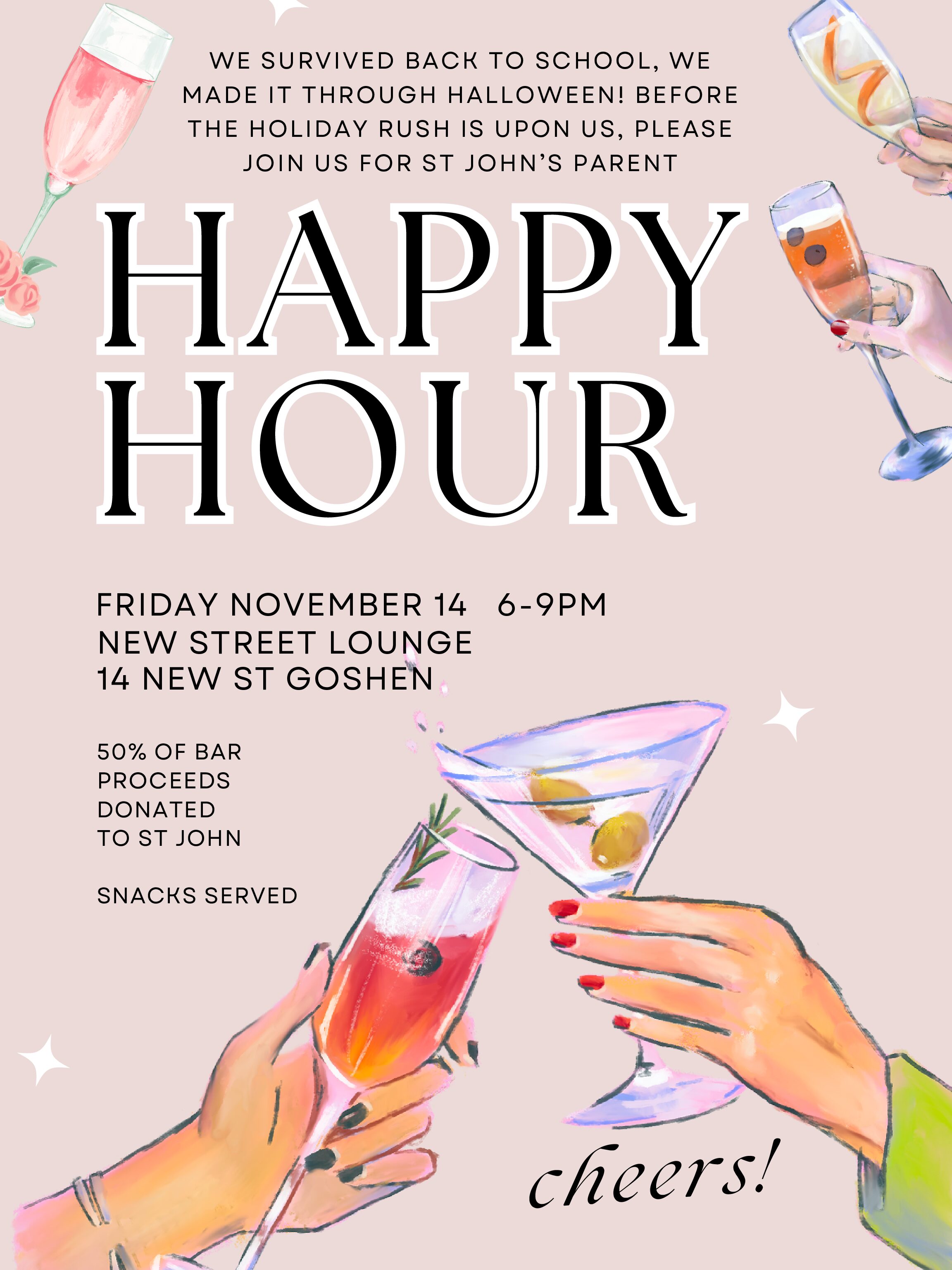 New Street Lounge is hosting Happy Hour for the St John’s parents and whoever wants to help support this wonderful school in our community! We are donating 50% of all sales to the school from 6:00-9:00! Raise your glass and help support!